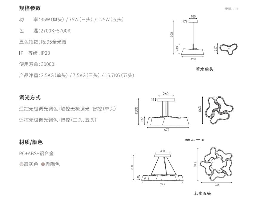 若水吊灯源于中国古典意境中的山水,,外形如山的曲线婀娜蜿蜒,,其内侧光晕水波纹,,缓缓晕开;巧妙地将曼妙光影融于山水意境,,如空间中悬浮的自然景观,,,专门设计调试的水波纹棱面扩散罩可以起到一定的视觉防眩作用,,,,把原本进入到人眼的杂散光折射掉,,,,同时可以提升产品的精致品质感;空间光的强功能性和强装饰性通常是个矛盾点,,,,但是若水则取得了一个平衡,,,,保证较强光学输出的同时可以有其装饰表现